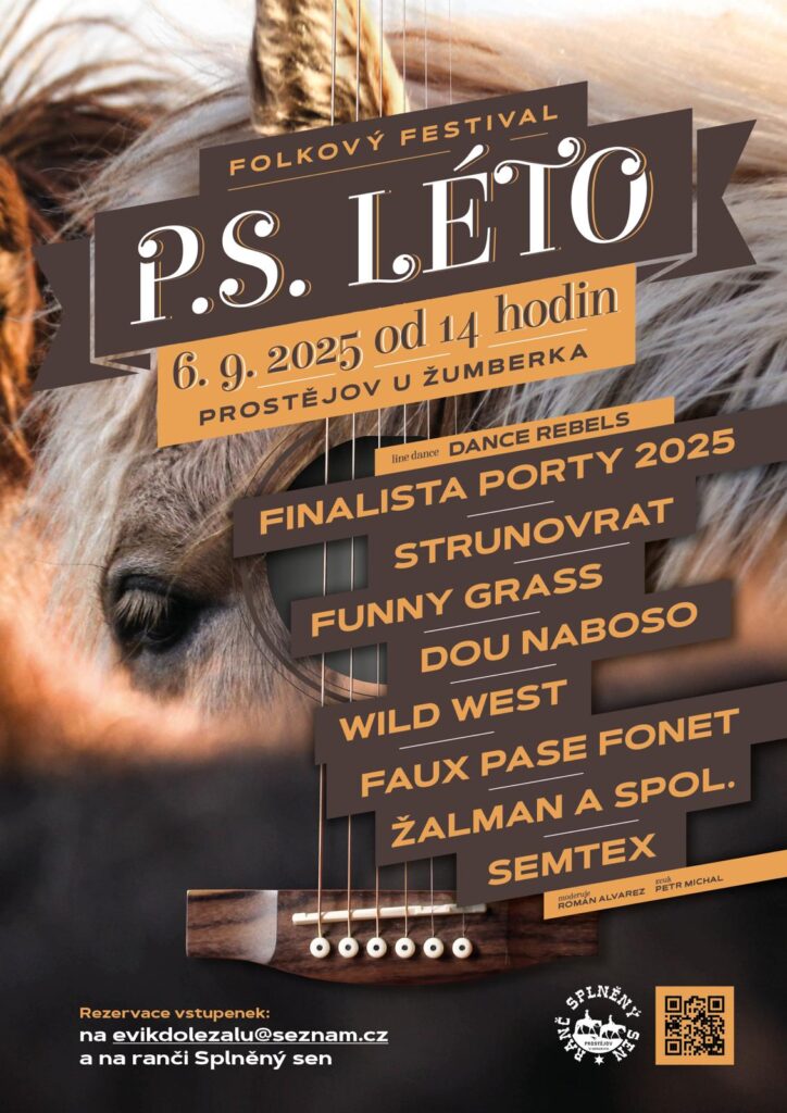 Folkový a country festival P.S. Léto se uskuteční 6. září 2025 na ranči Splněný sen v Prostějově u Žumberka, okres Chrudim.